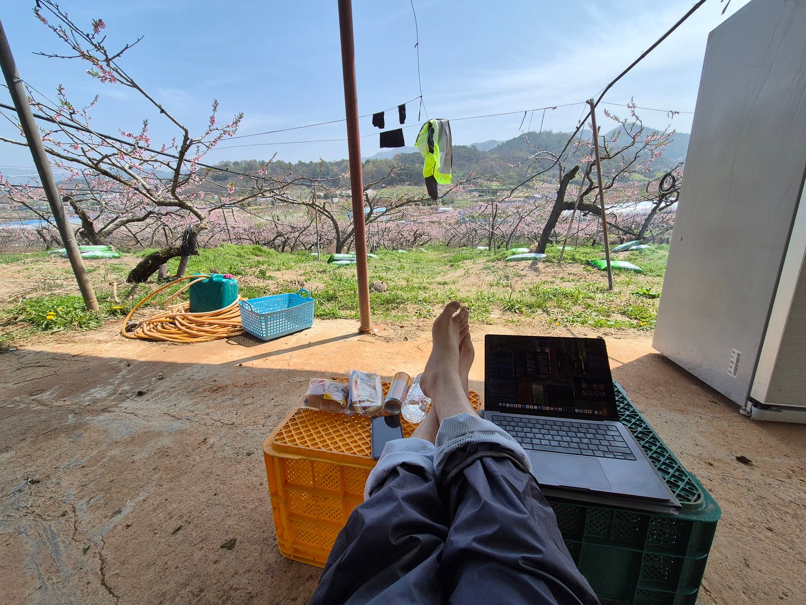 쉬다가 찍은 사진 한 장. 복숭아꽃이 활짝 핀 과수원을 바라보면서 노트북 펴놓고 잠깐 숨 돌리는 중이야. 368포를 날랐더니 발에 땀이 장난 아니게 차서 신발 벗고 식히는 중이야. IT 20년 하다가 과수원에서 퇴비 나르고 있는 이 상황이 가끔 웃기기도 해.